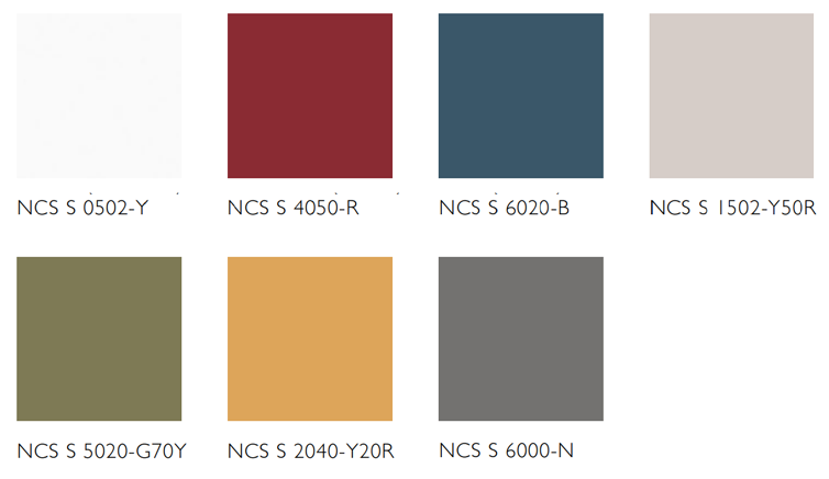 | Выбор цвета | NCS S 0502-Y – малярный белый, NCS S 1502-Y50R – бежево-серый, NCS S 2040-Y20R – жёлто-оранжевый, NCS S 4050-R – тёмно-красный, NCS S 5020-G70Y – оливково-зелёный, NCS S 6000-N – тёмно-серый, NCS S 6020-B – тёмно-синий |