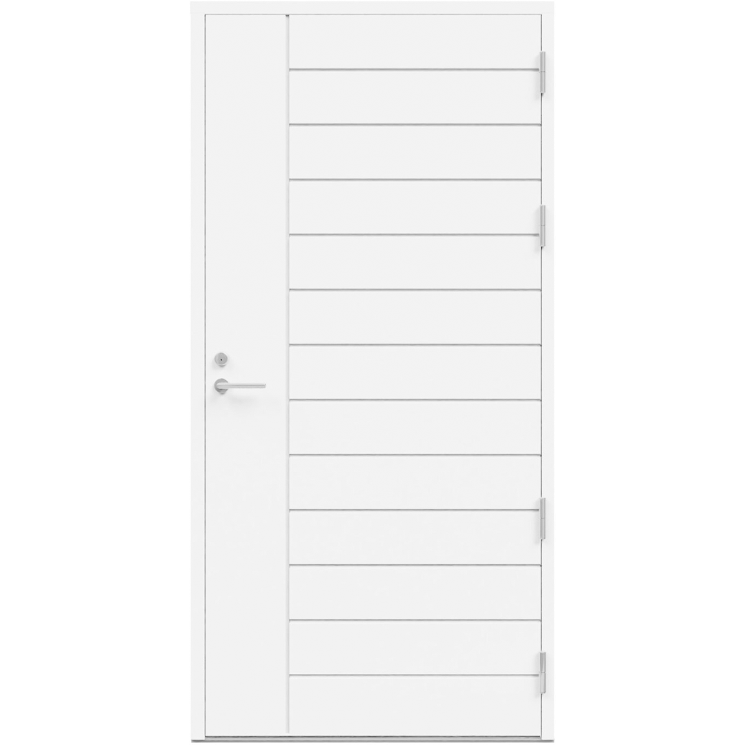 HDF-pind, tugevdatud alumiiniumplaadiga. Uste konstruktsioon on valmistatud pikijätkatud männipuidust, mida on kombineeritud vineeriga. Soojusisolatsiooniga ukse kogupaksus on 86 mm. Välimine külg dekoratiivse freesitud mustriga, sisemine külg sile. Saadaval ka dekoratiivse freesitud mustrita, st sileda pinnaga mõlemal küljel.