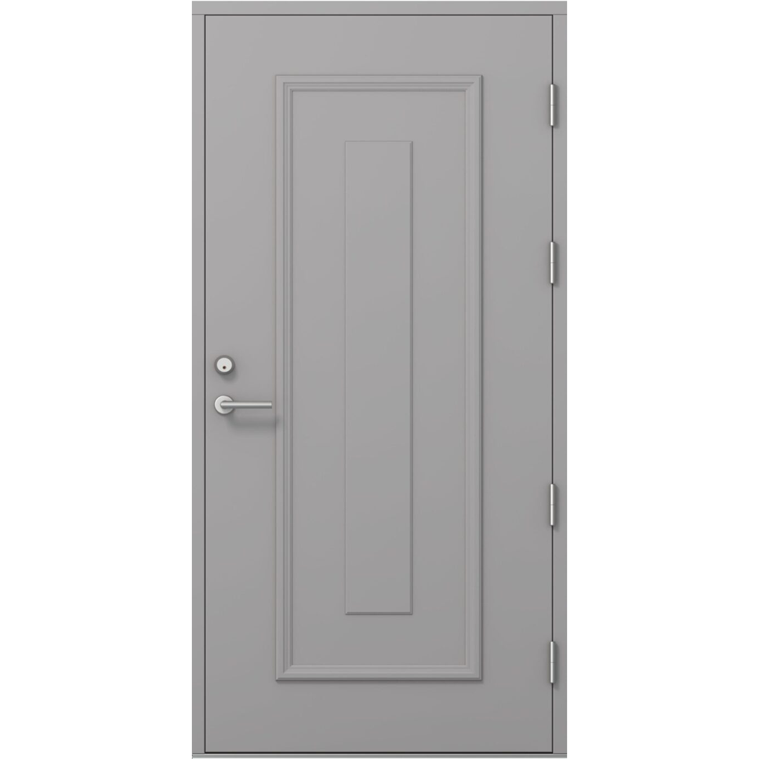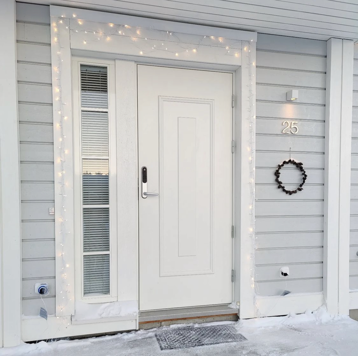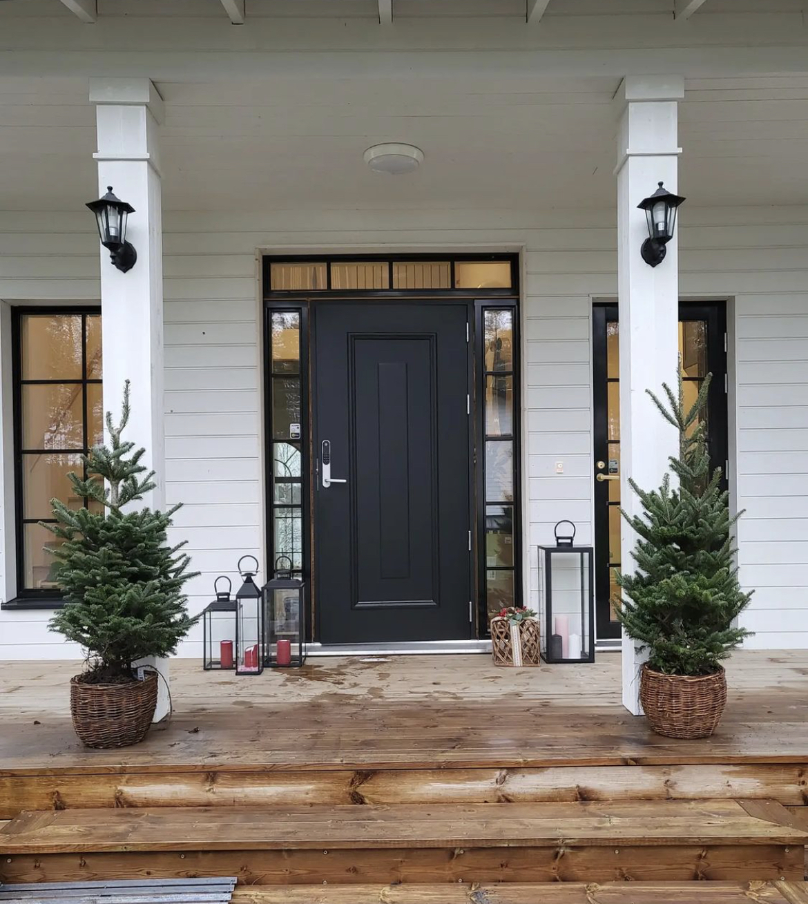 HDF-pind, tugevdatud alumiiniumplaadiga. Vineeri ja liimpuidu kombinatsioonist valmistatud uksekaunistused. Soojusisolatsiooniga ukse paksus on 86 mm. Klaas ja kaunistused taluvad temperatuuri ja niiskuse kõikumisi. Ukse sisepind on sile.