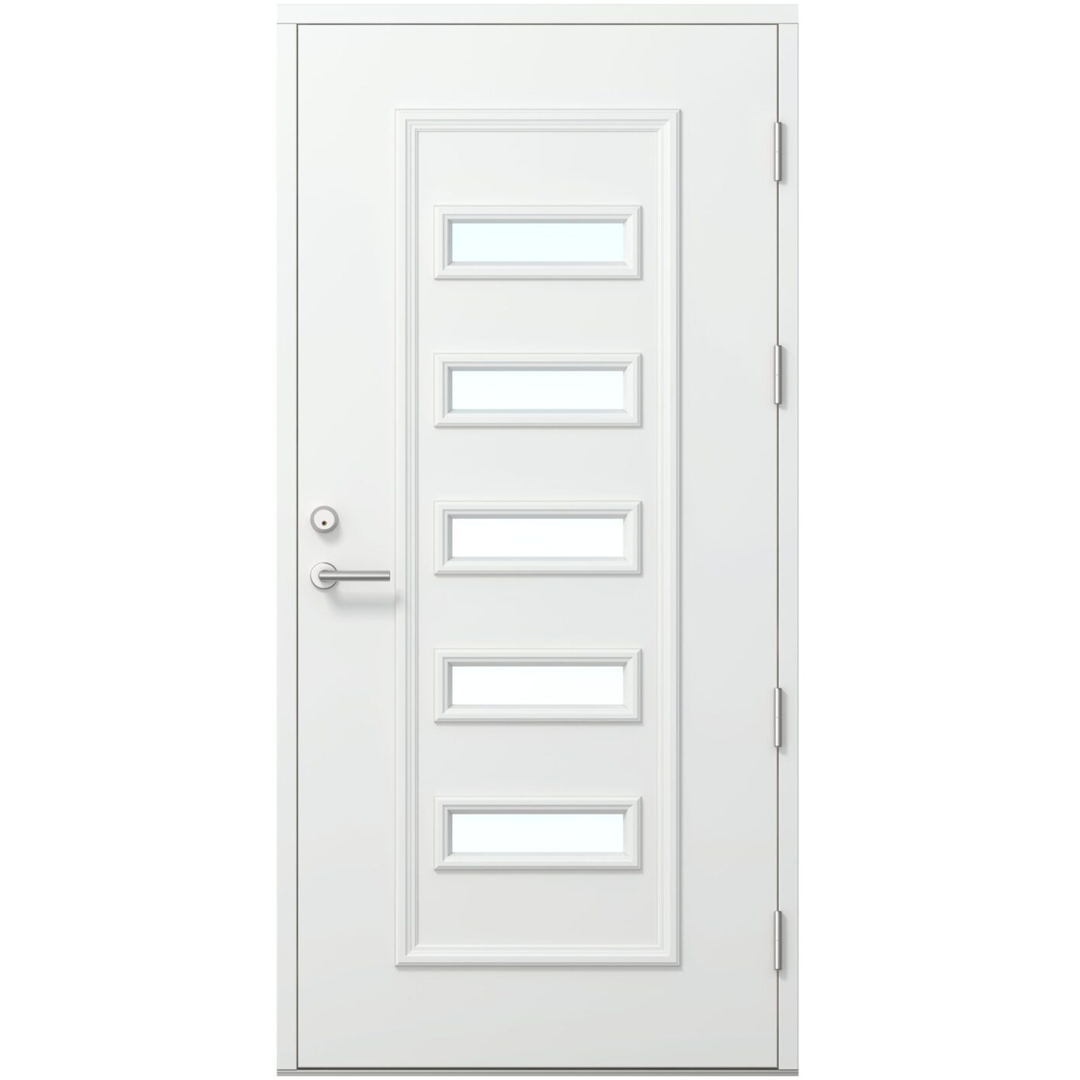 HDF-pind, tugevdatud alumiiniumplaadiga. Vineeri ja liimpuidu kombinatsioonist valmistatud uksekaunistused. Soojusisolatsiooniga ukse paksus on 86 mm. Klaas ja kaunistused taluvad temperatuuri ja niiskuse kõikumisi. Ukse sisepind on sile.
