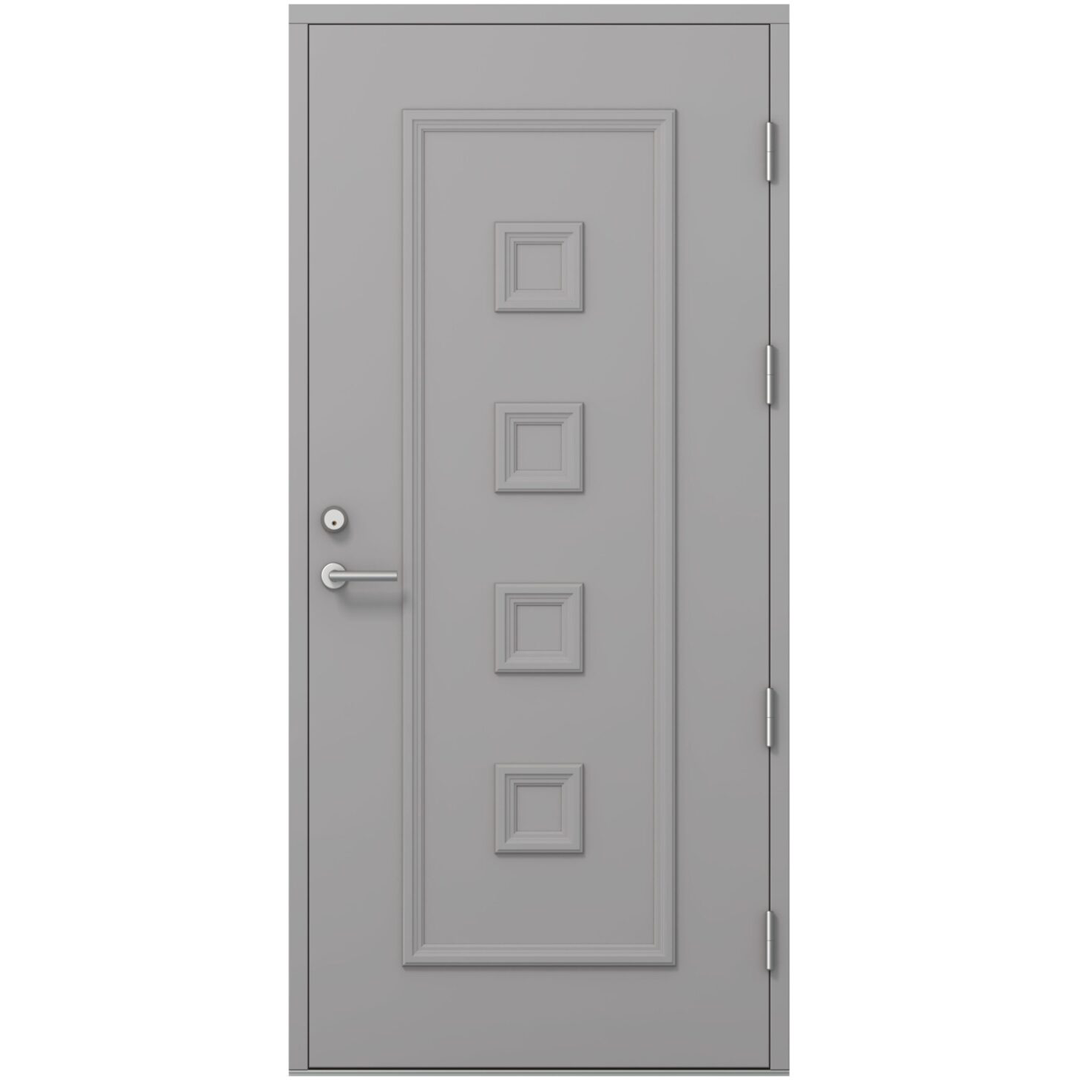 HDF-pind, tugevdatud alumiiniumplaadiga. Vineeri ja liimpuidu kombinatsioonist valmistatud uksekaunistused. Soojusisolatsiooniga ukse paksus on 86 mm. Klaas ja kaunistused taluvad temperatuuri ja niiskuse kõikumisi. Ukse sisepind on sile.