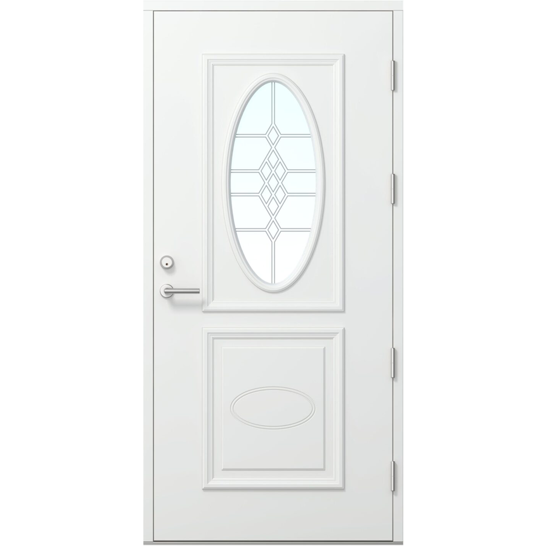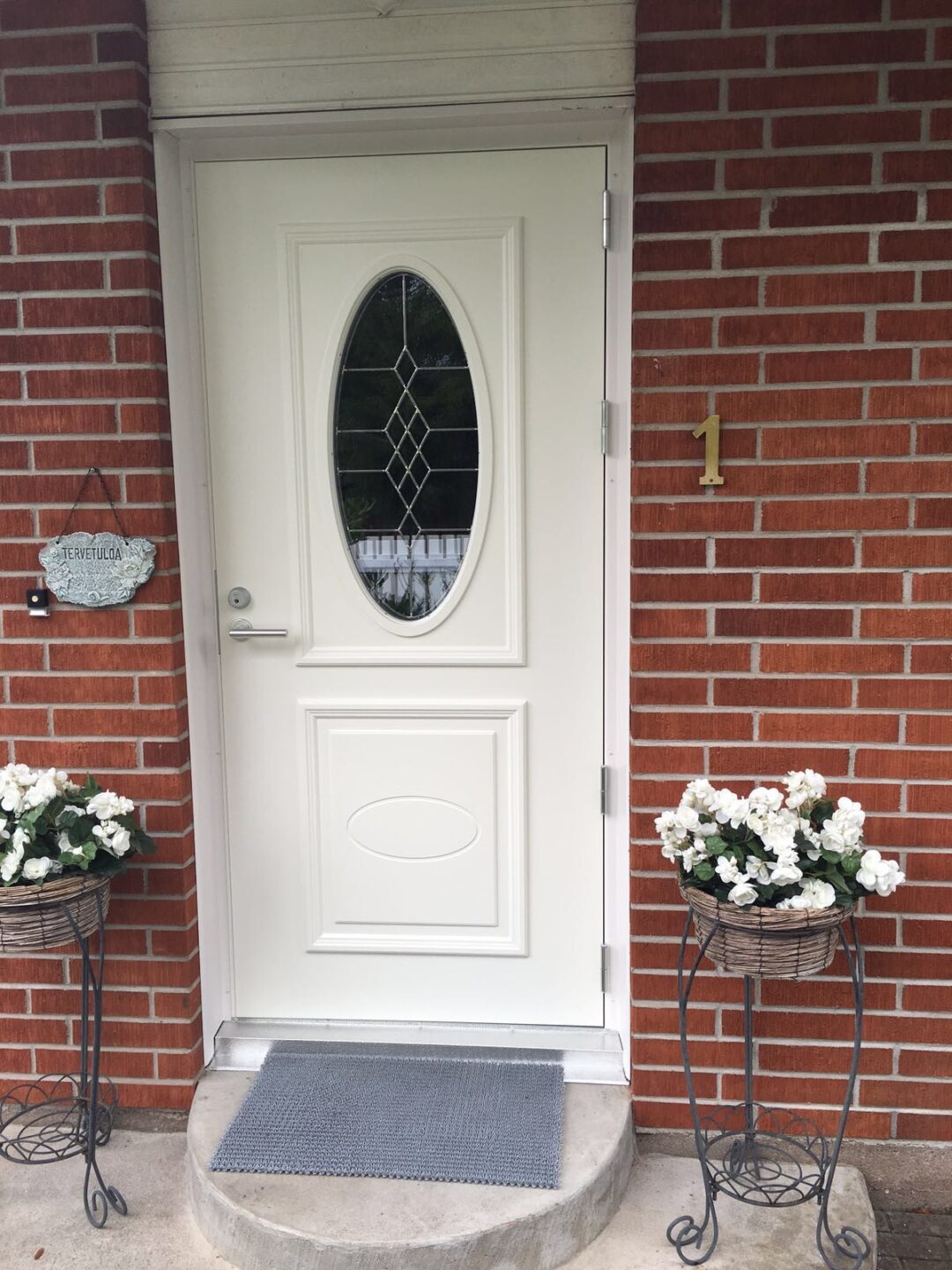 HDF-pind, tugevdatud alumiiniumplaadiga. Vineeri ja liimpuidu kombinatsioonist valmistatud uksekaunistused. Soojusisolatsiooniga ukse paksus on 86 mm. Klaas ja kaunistused taluvad temperatuuri ja niiskuse kõikumisi. Ukse sisepind on sile.