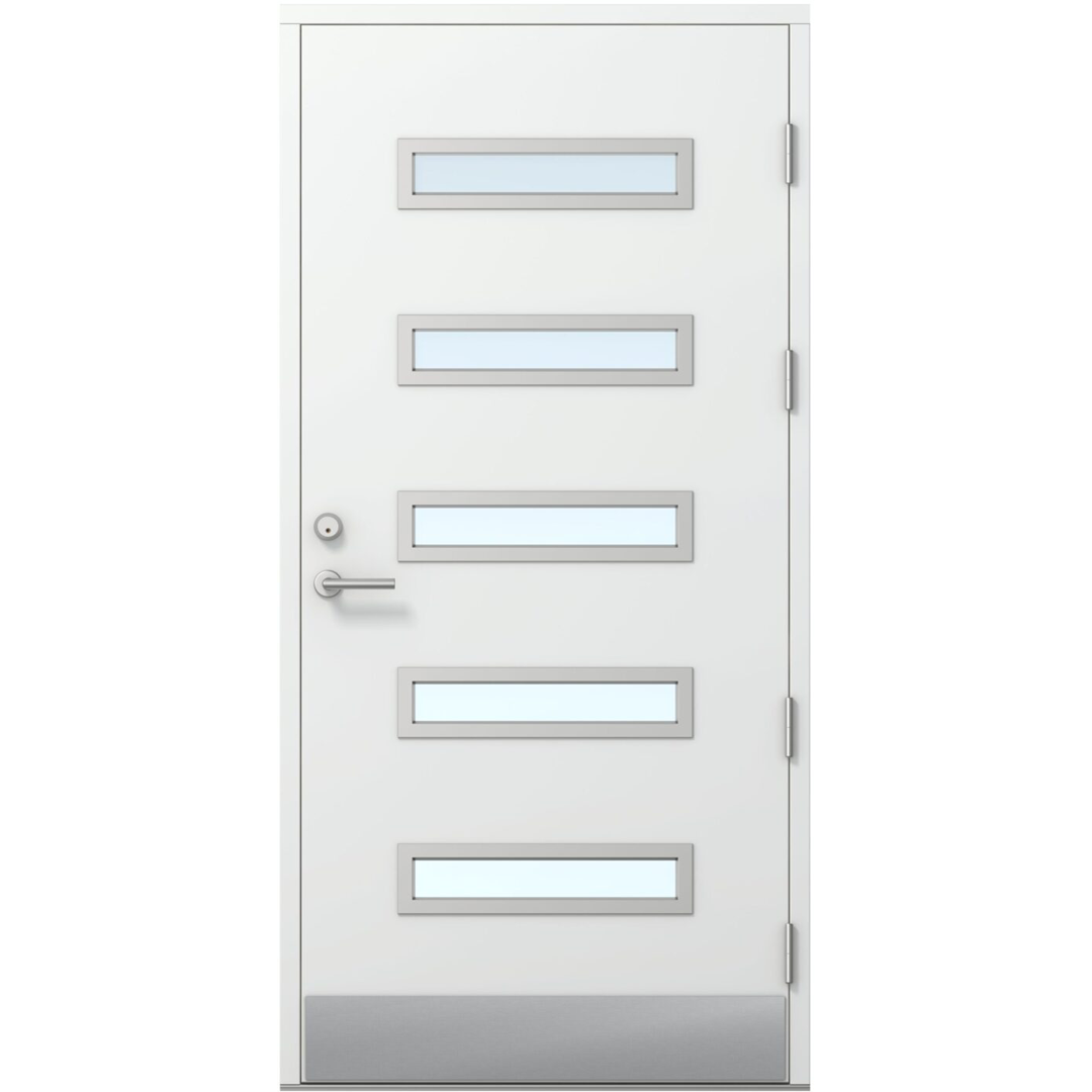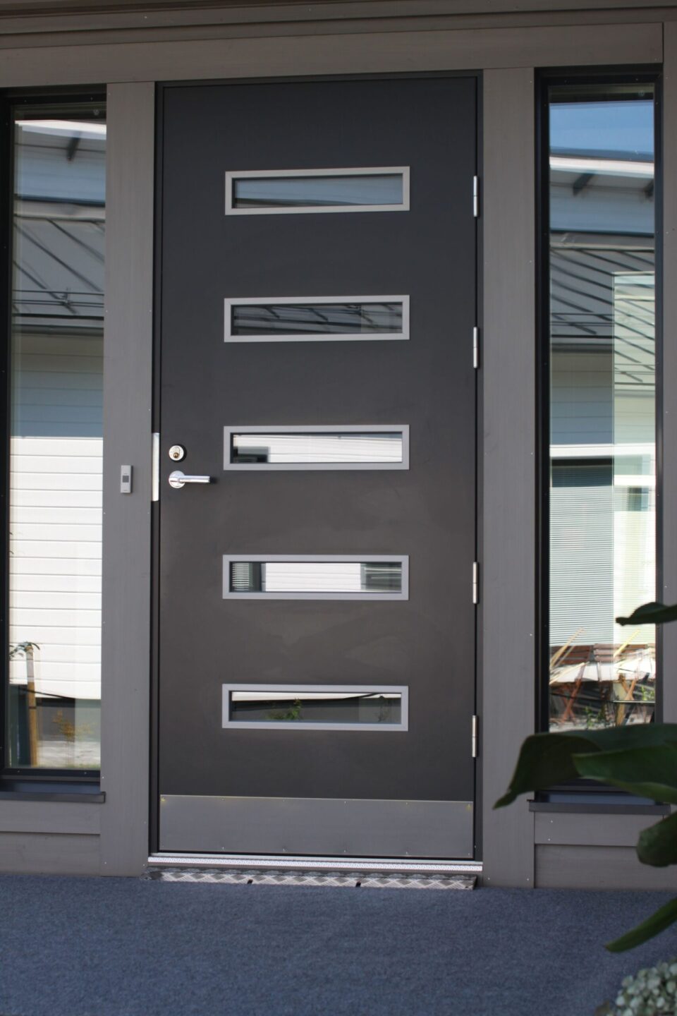 HDF-pind, tugevdatud alumiiniumplaadiga. Uste konstruktsioon on valmistatud pikijätkatud männipuidust, mida on kombineeritud vineeriga. Soojusisolatsiooniga ukse kogupaksus on 86 mm. Pind on mõlemalt poolt sile, ilma dekoratiivse graveeringuta. Ukse välisküljel on standardvarustuses 160 mm kõrgune matt alumiiniumplaat, mis kaitseb ust kriimustuste ja löökide eest. Klaasiliistud on valmistatud PVC-st, värvitud alumiiniumtoonis või mistahes toonis vastavalt soovile.